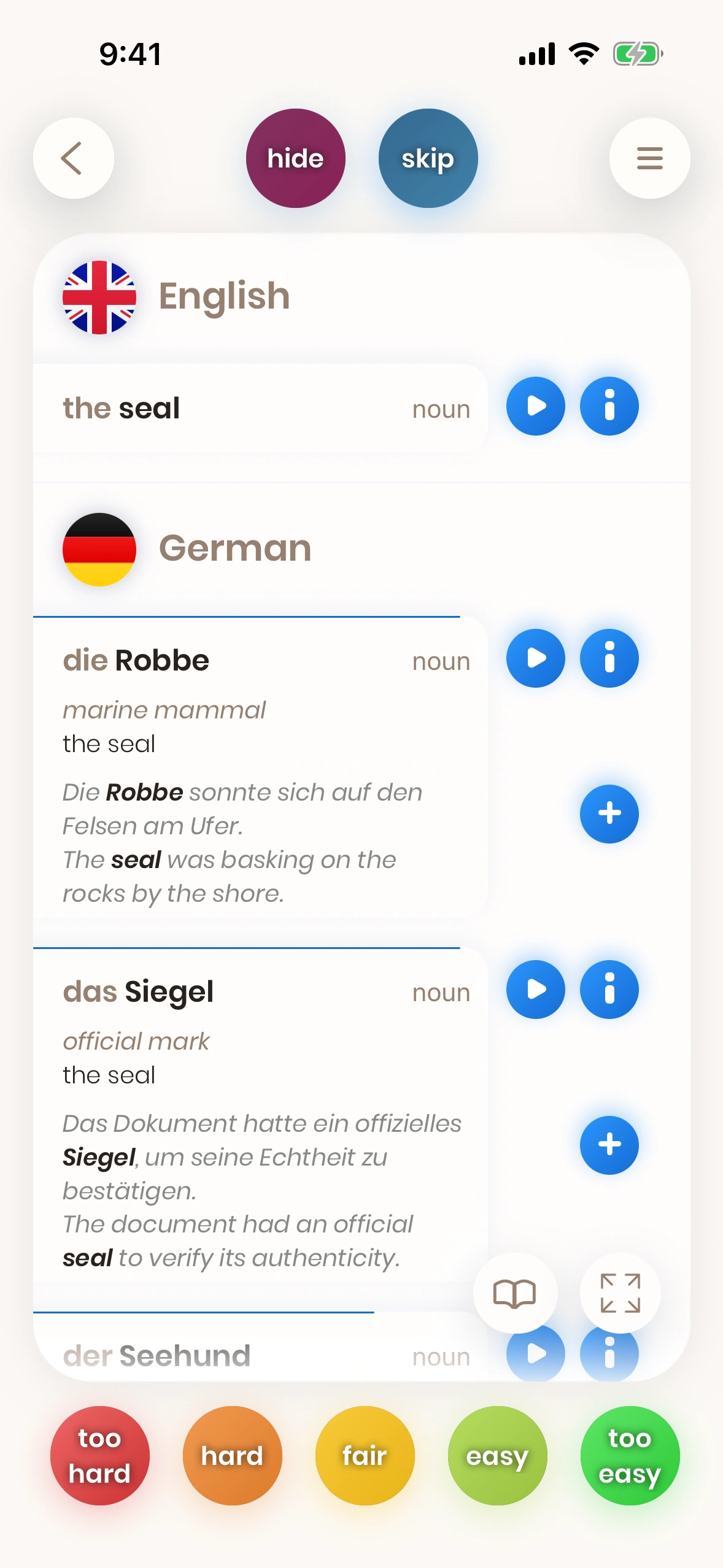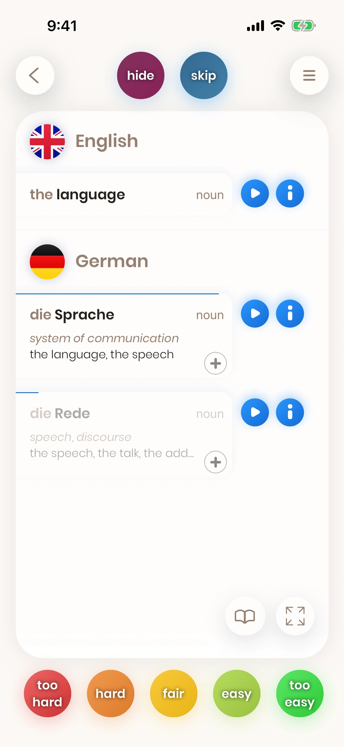Look at a card. Try to translate the word or phrase. Turn the card. Tell us how difficult it was. Difficult words and phrases are shown again soon.