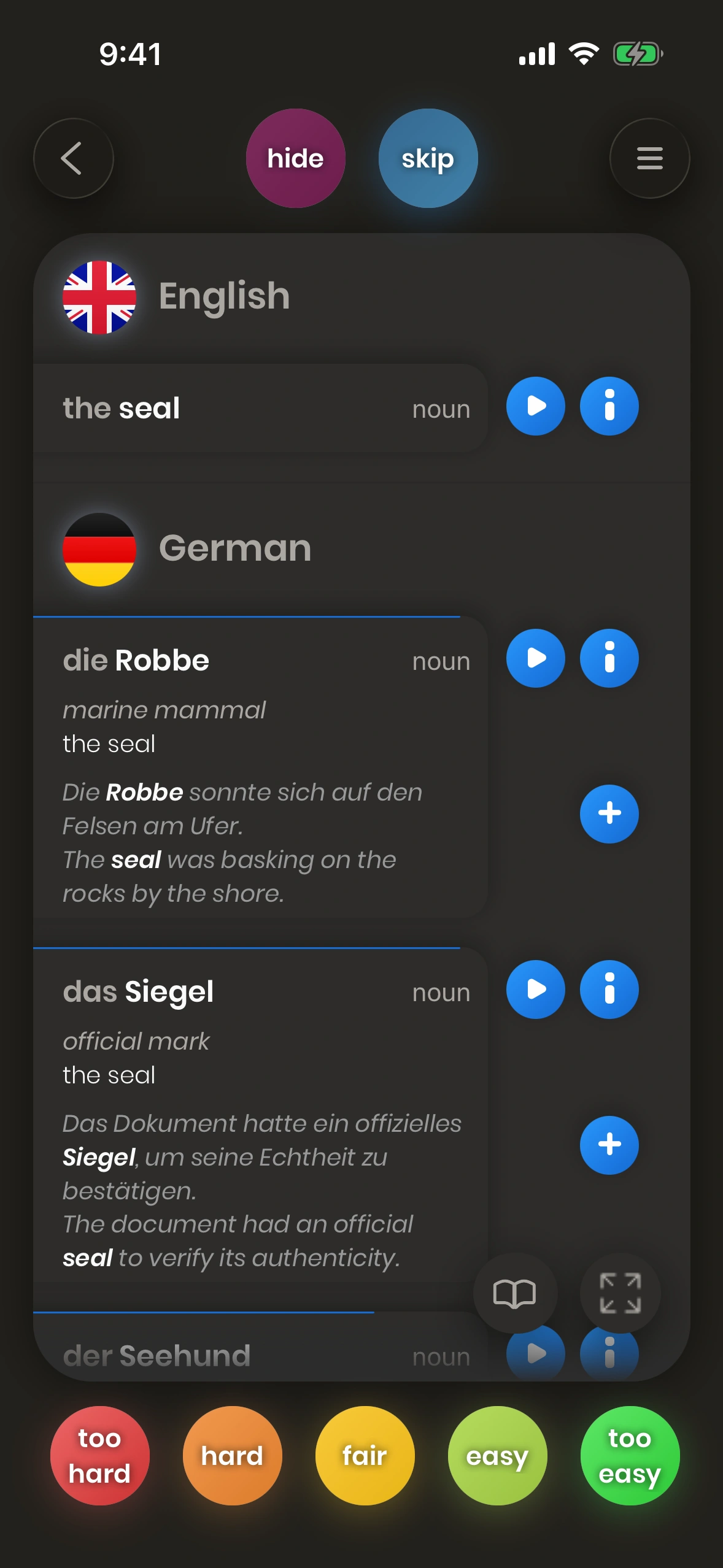 It can be hard to remember such fine distinctions, but with Just German, you can practice them in context. The easiest way to never forget what "seal" means in German is by adding those example sentences to your learning queue.