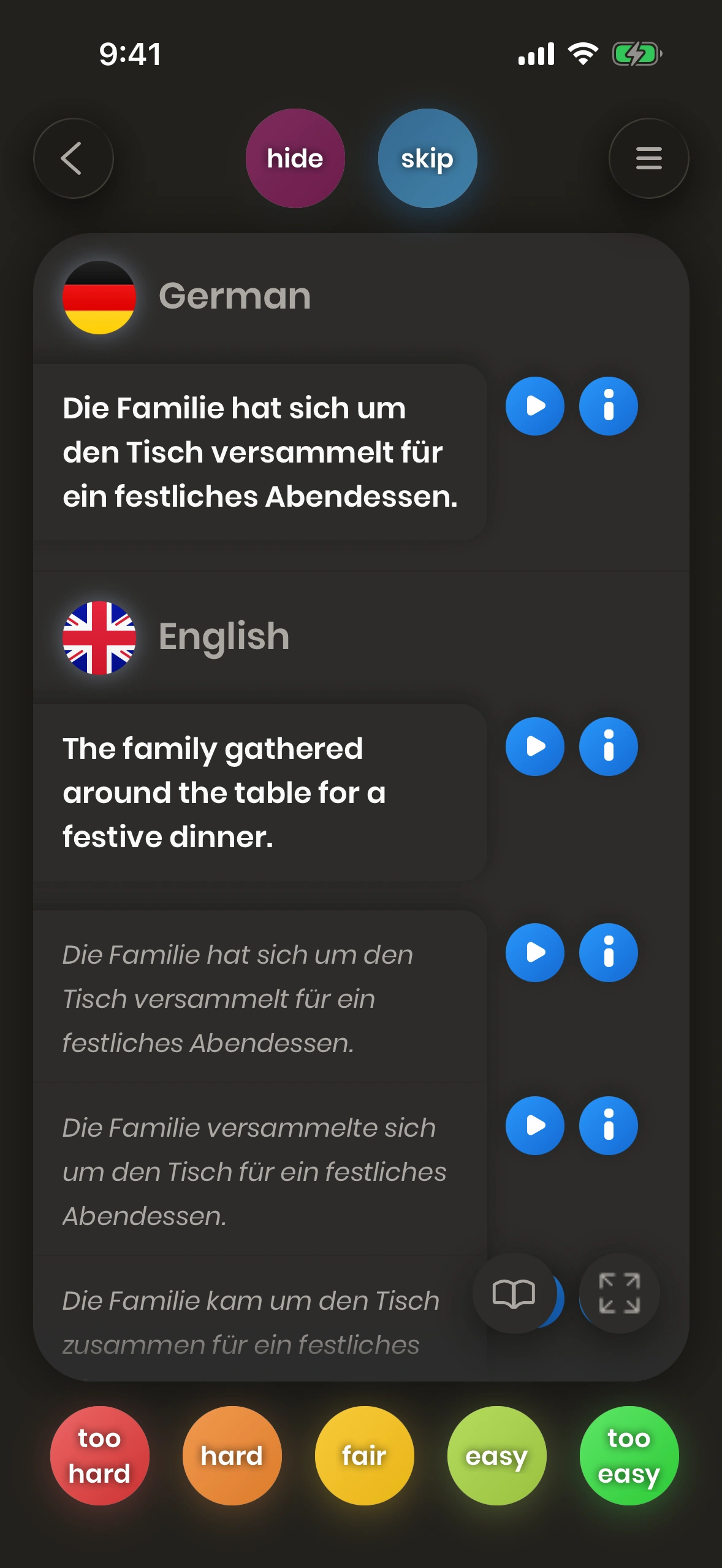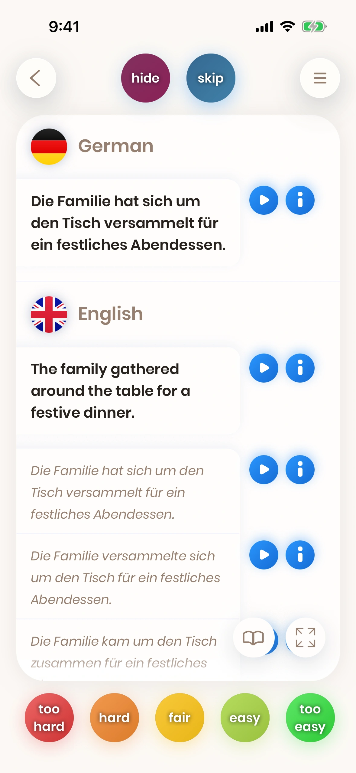 Like Word cards, Sentence cards too have their direction. Either you translate English-to-German or German-to-English. For most Sentence cards, there is an equivalent card in the other direction.