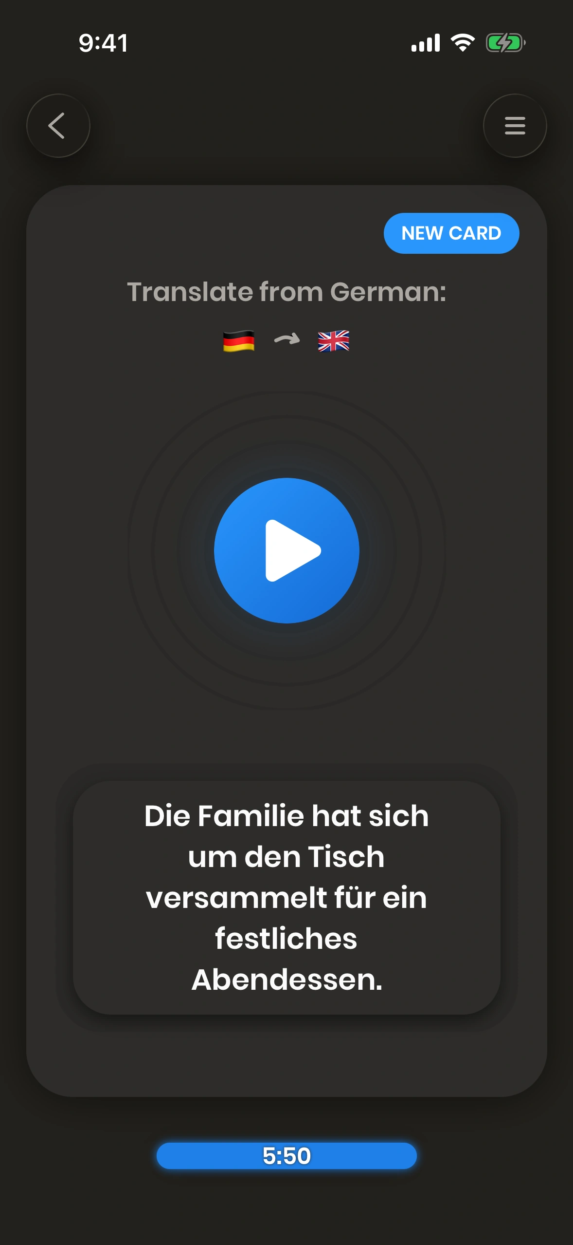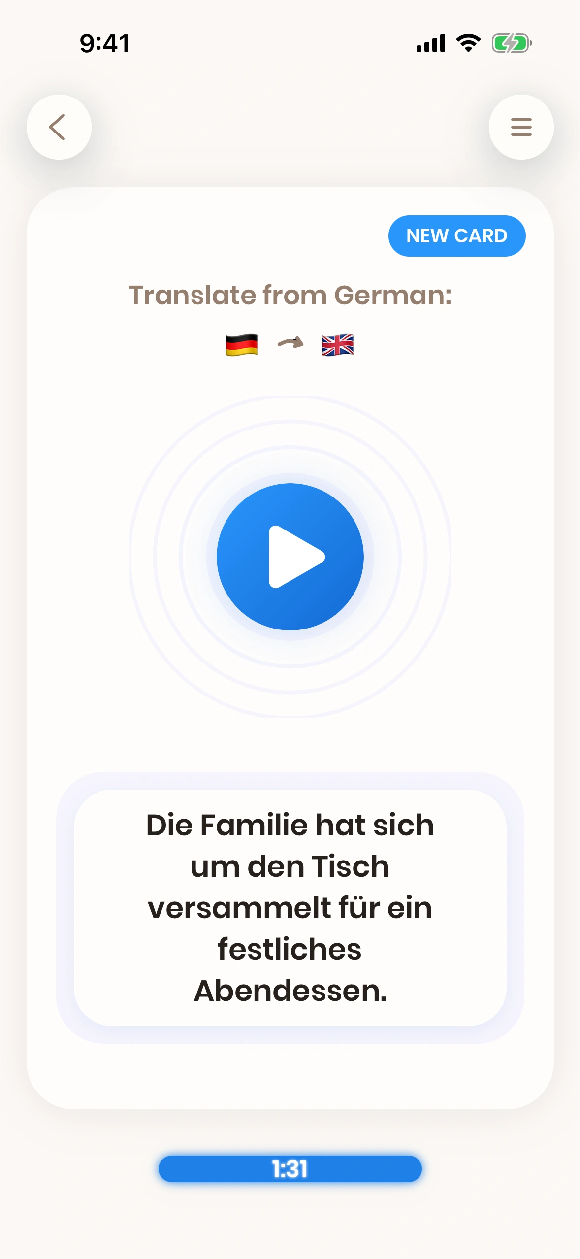 - The card invites you to translate a word or a phrase. You try to do that.