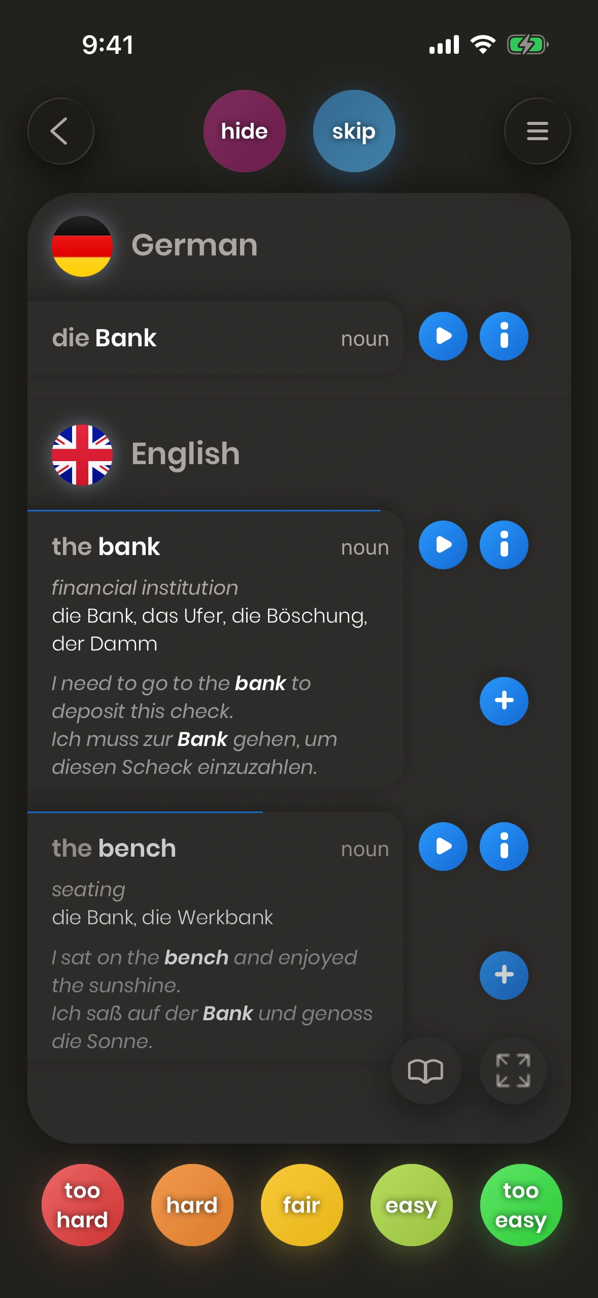 - Depending on whether you "knew" the translation or not, you grade the card hard or easy (see next chapter for details).