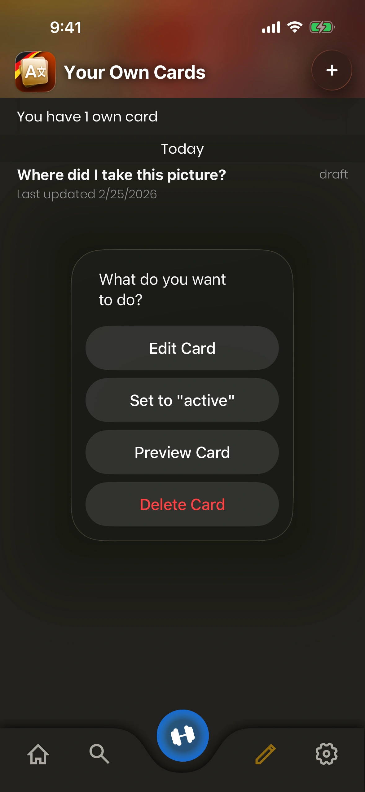 - Card Status: An Own Card is either in "draft" mode or "active". Draft cards are not shown while learning. To change the status of a card, tap it.