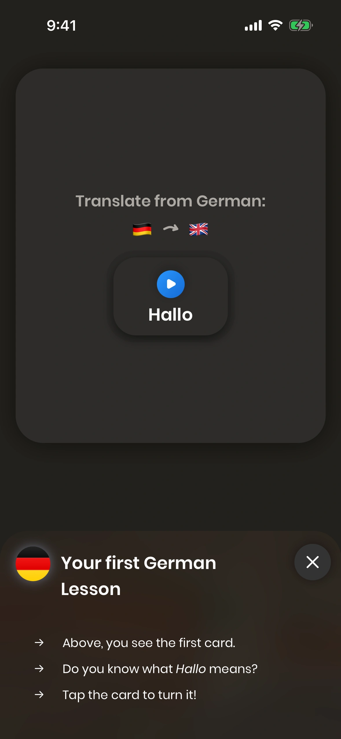 When you start Just German for the first time, you will be guided through the tutorial.