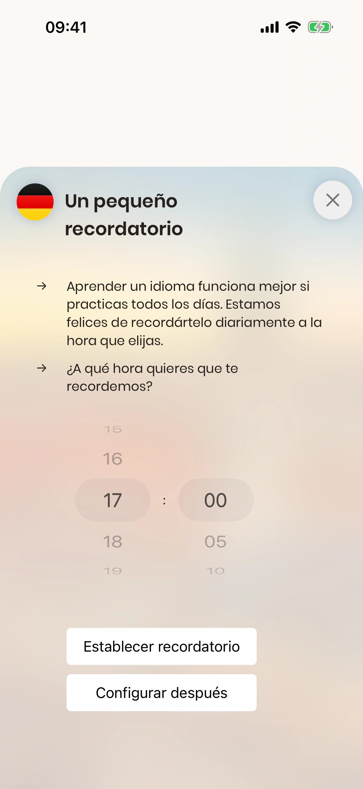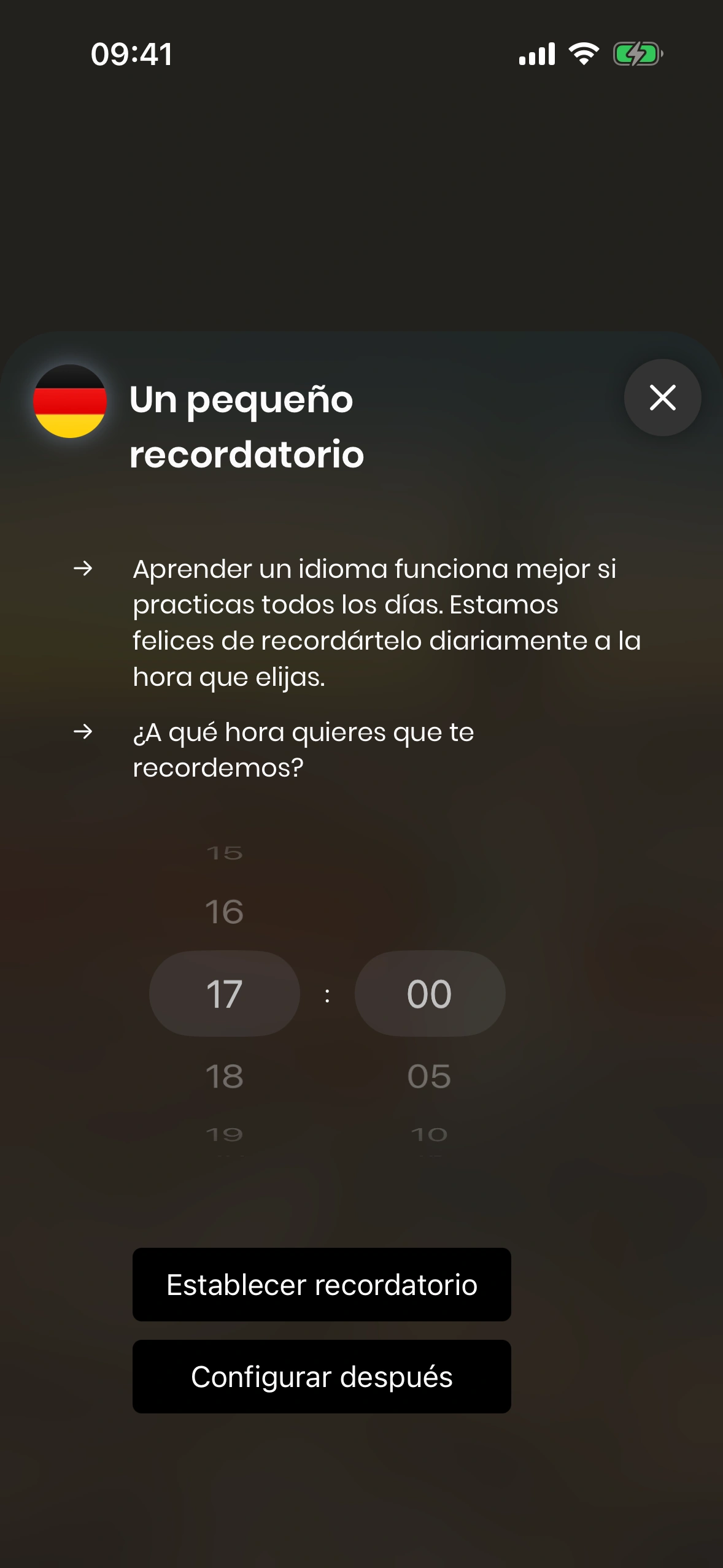 - En el día a día con trabajo, familia y amigos, es fácil olvidarse de la lección diaria. Por eso Just German ofrece recordatorios diarios. Puedes activarlos tanto en el tutorial como en los ajustes.
