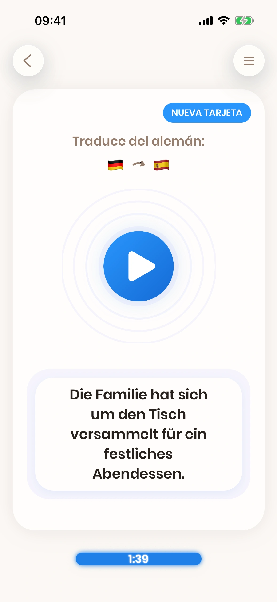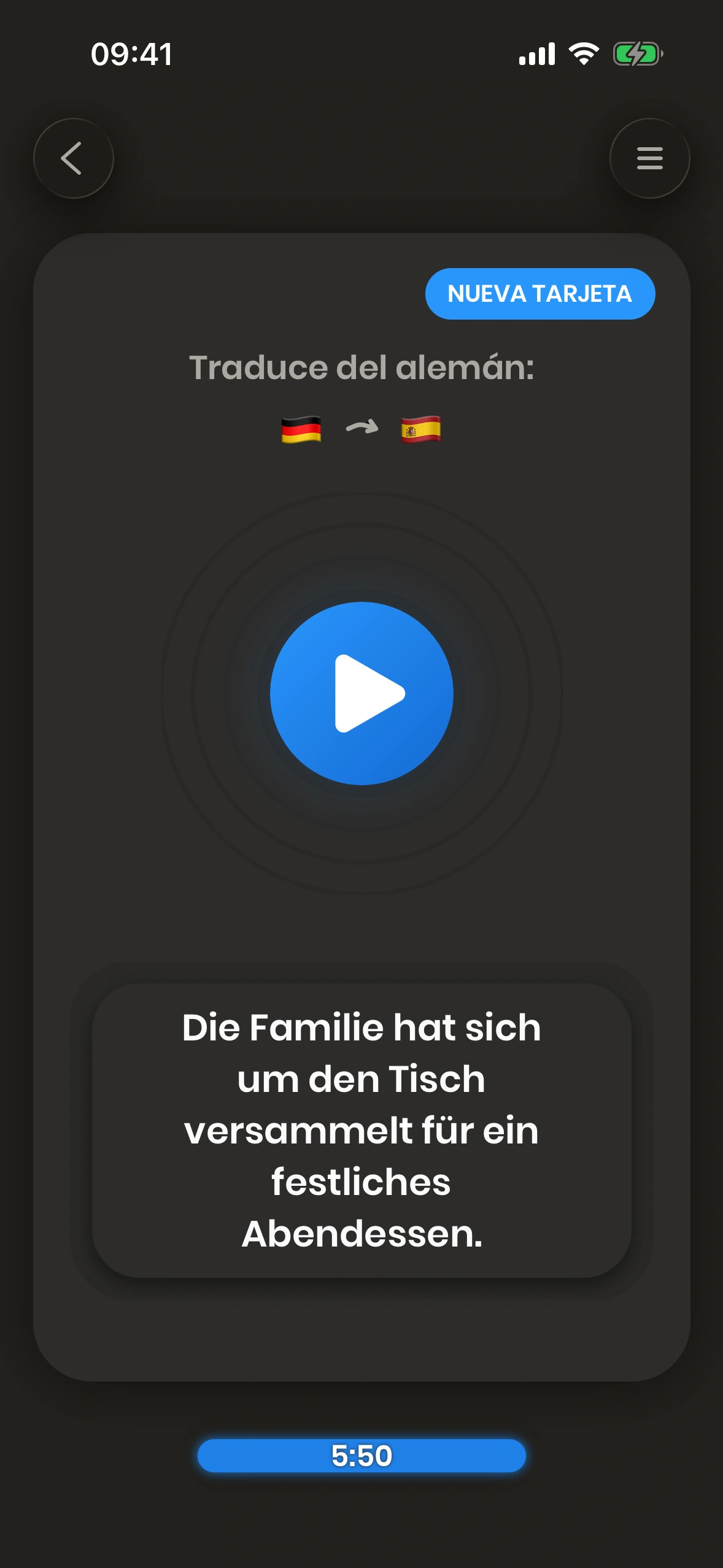 Just German está optimizada para el aprendizaje rápido. Tómate el tiempo que necesites, pero aprenderás de forma más eficiente si repasas las tarjetas con agilidad. Más información aquí.