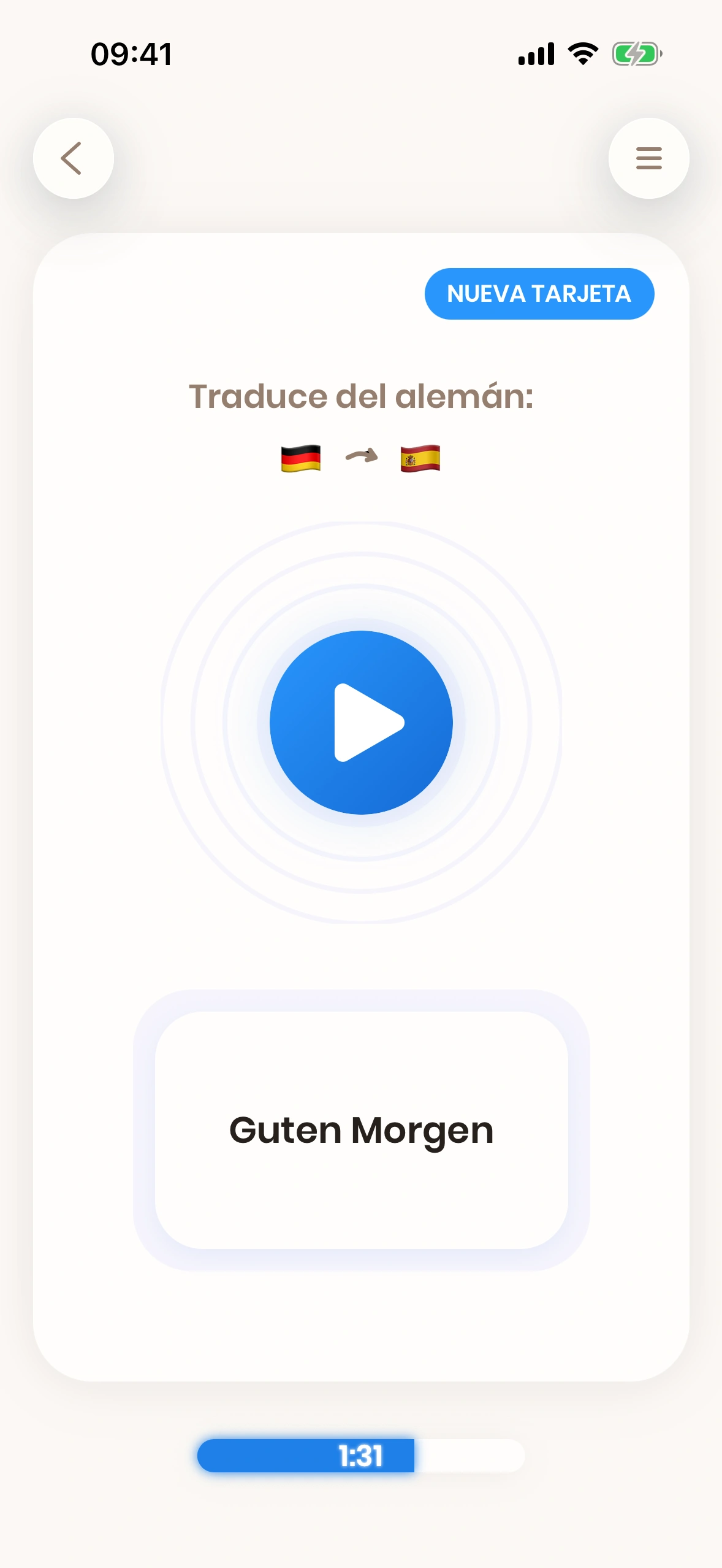 Al aprender un idioma, no deberías necesitar mucho tiempo para descifrar una traducción. O la recuerdas en pocos segundos — o no. Imagina una conversación en Alemán: si necesitas varios segundos para cada palabra, todavía no está asentada.