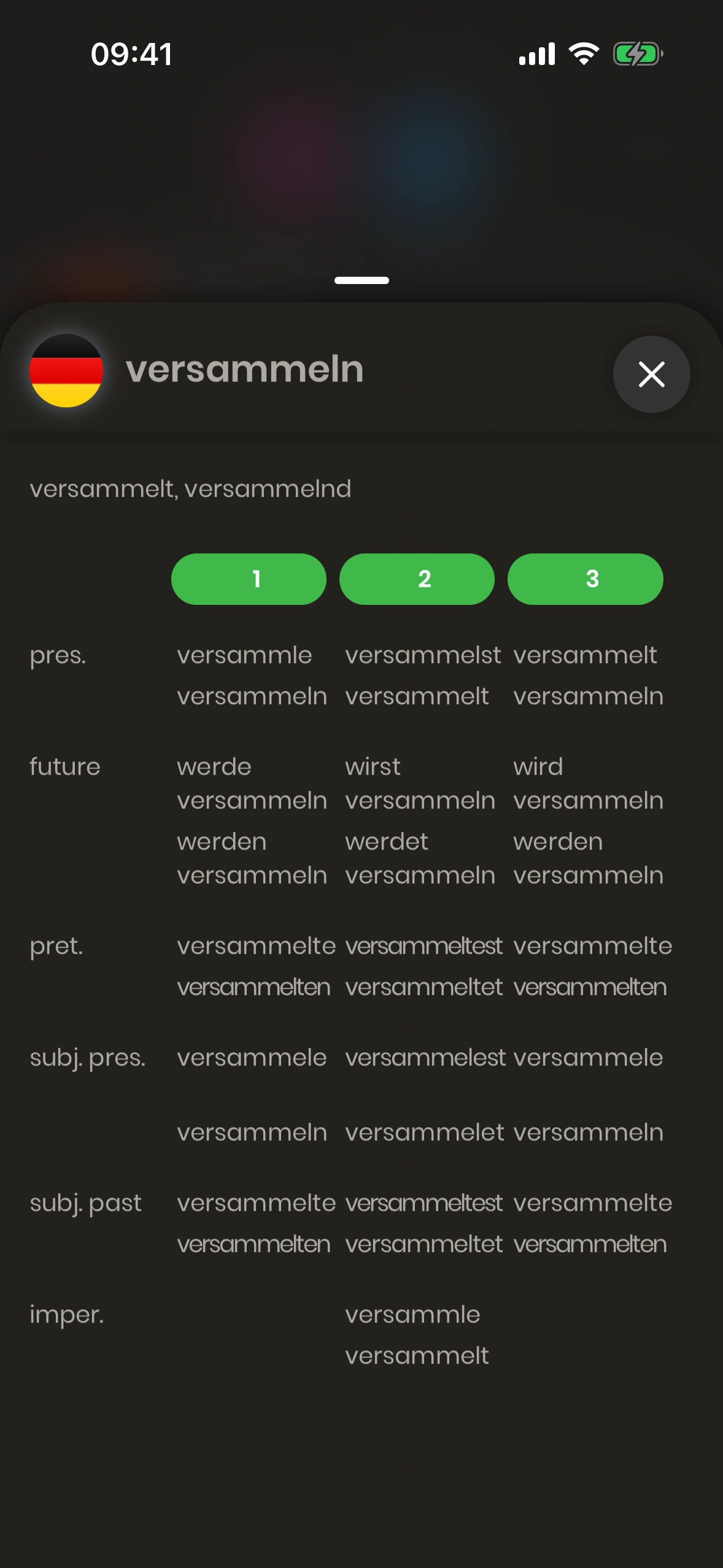 El diálogo de conjugación muestra la conjugación de un verbo. Toca el botón de añadir junto al verbo y luego "Tabla de conjugación".