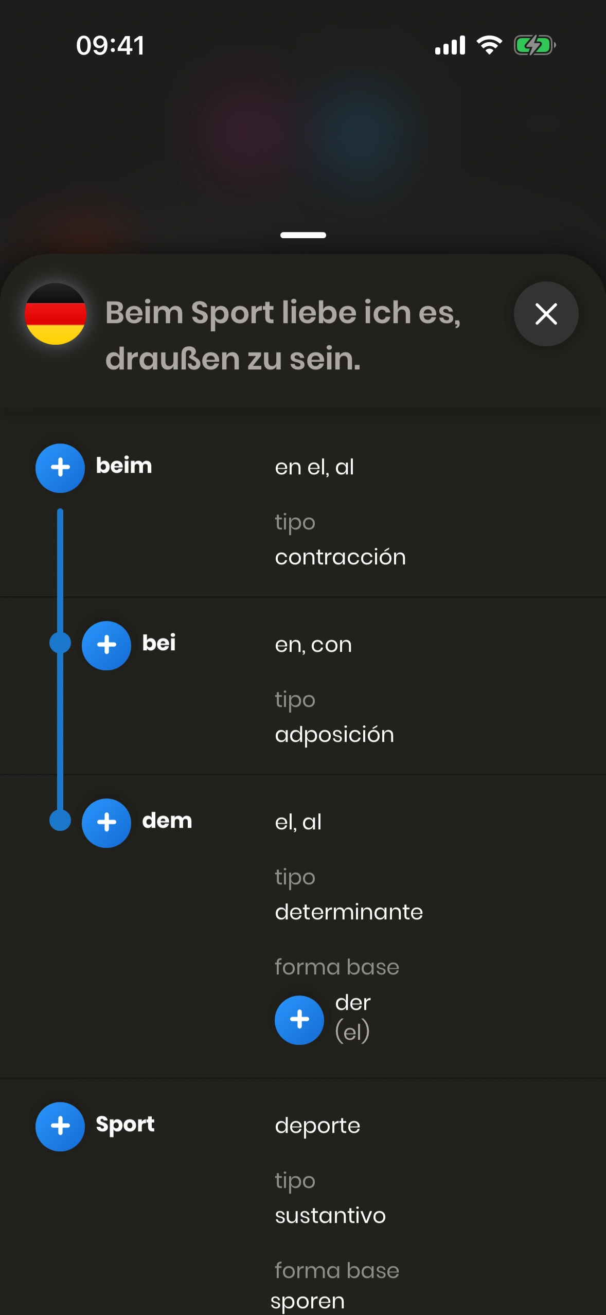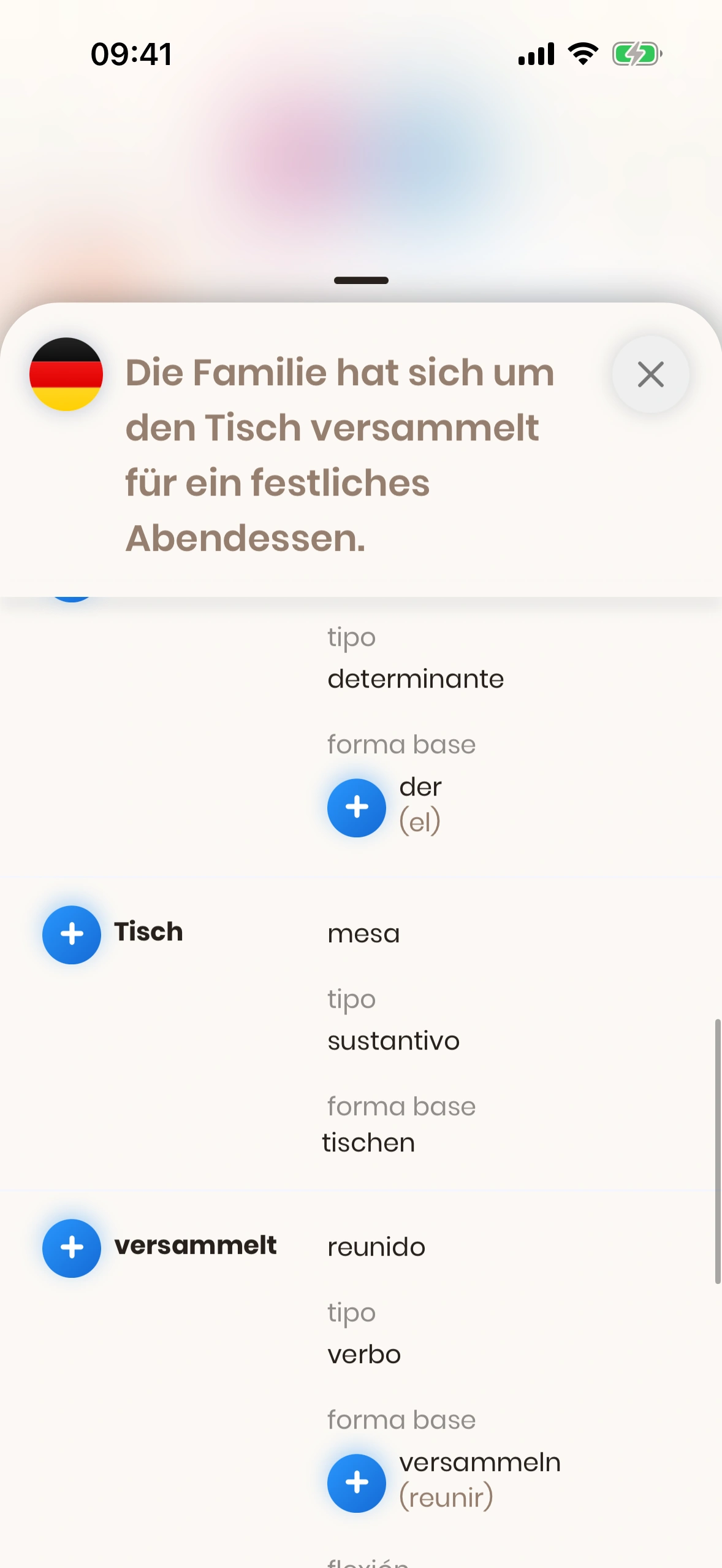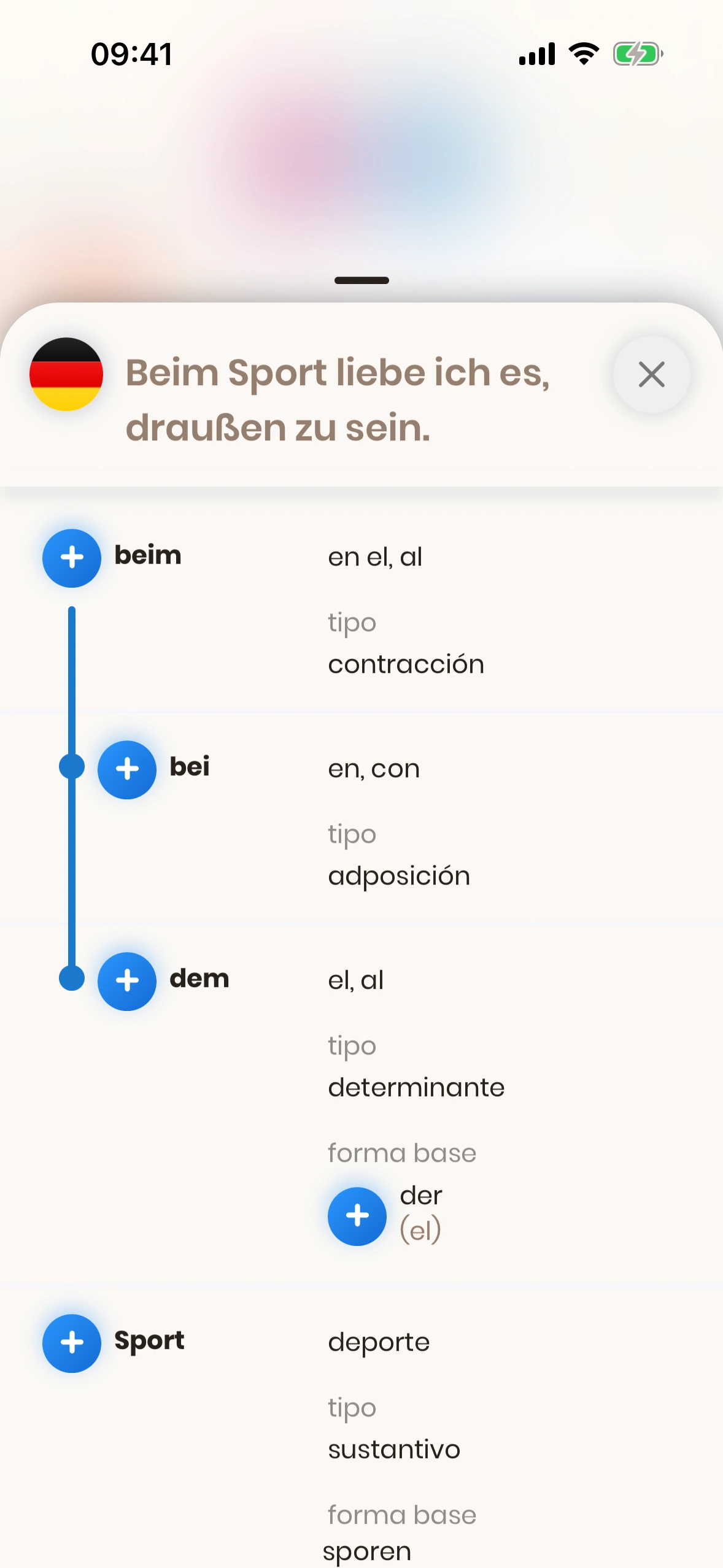 El diálogo de estructura de frase aparece cuando tocas el (i) en una tarjeta de frase — junto a la frase en el idioma de destino.