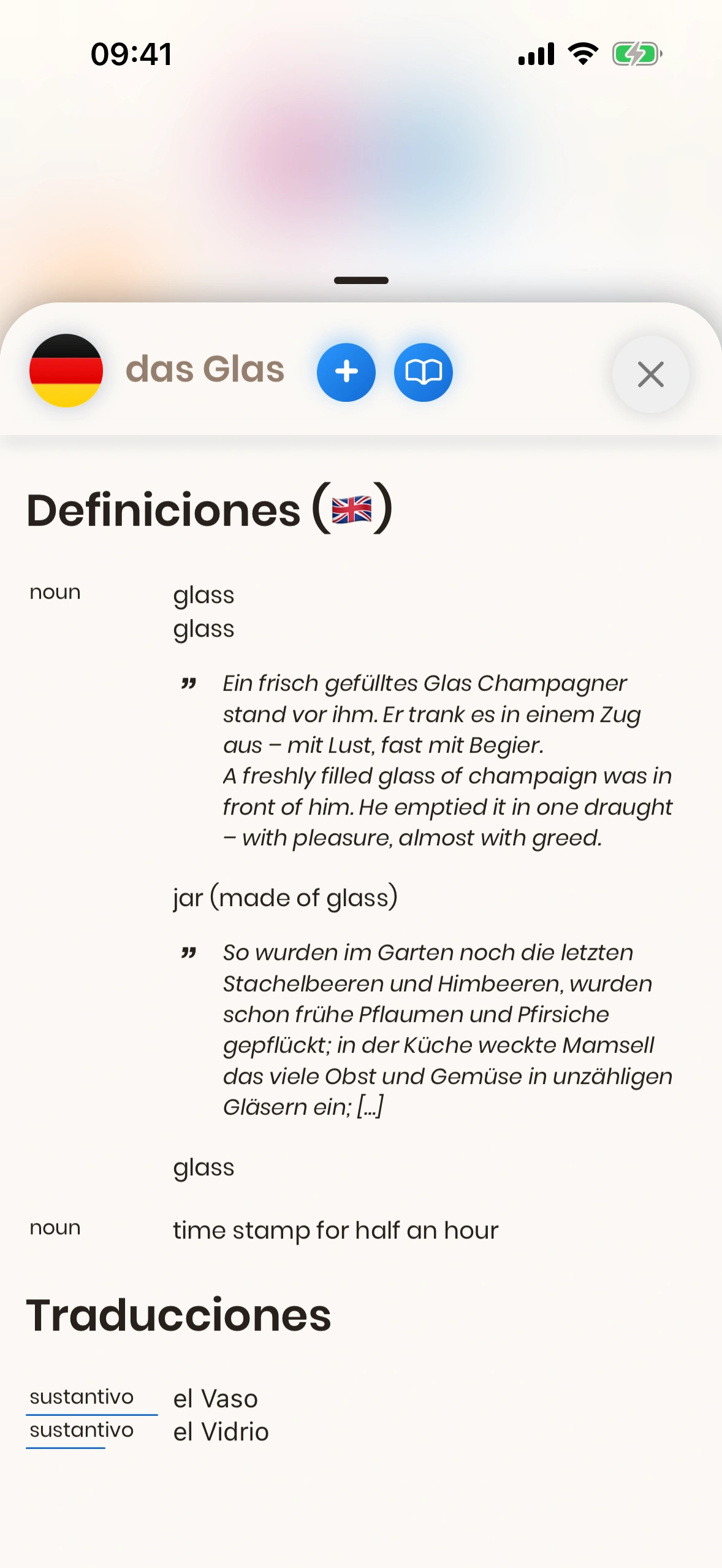 El botón de añadir lo encuentras en varios lugares de Just German. Ofrece, entre otras cosas:
