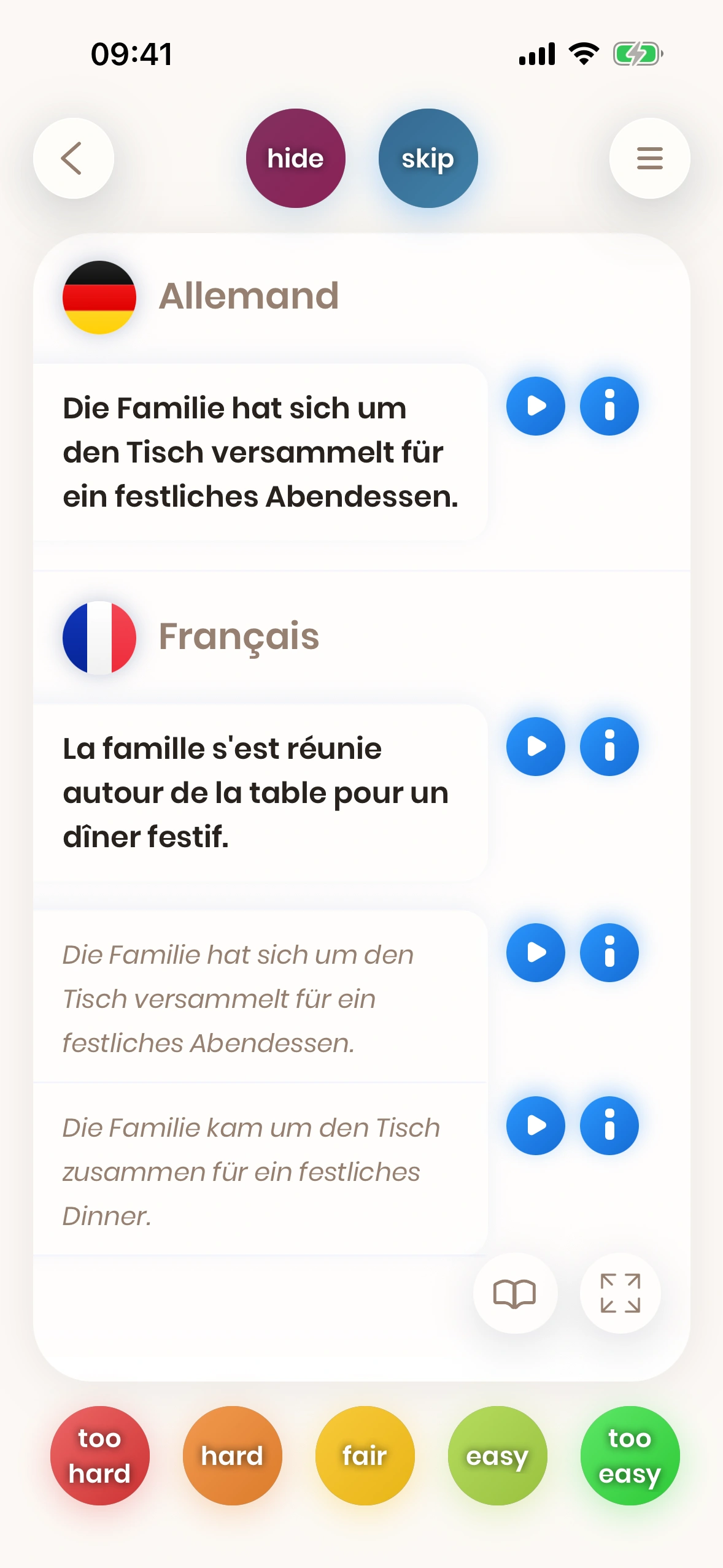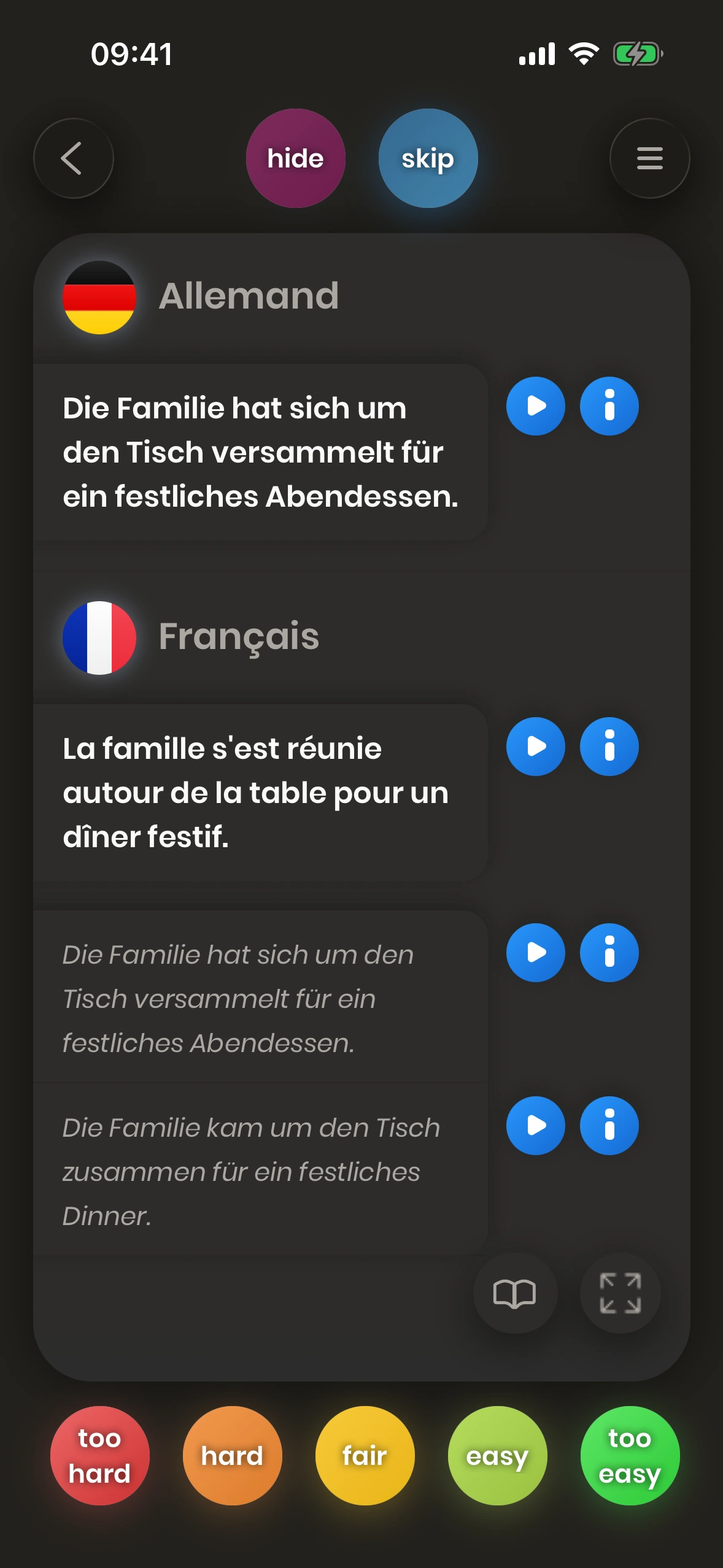 Comme pour les cartes de mots, il y a des directions : Français-en-Allemand ou Allemand-en-Français. La plupart des cartes de phrases ont un équivalent dans l'autre sens.