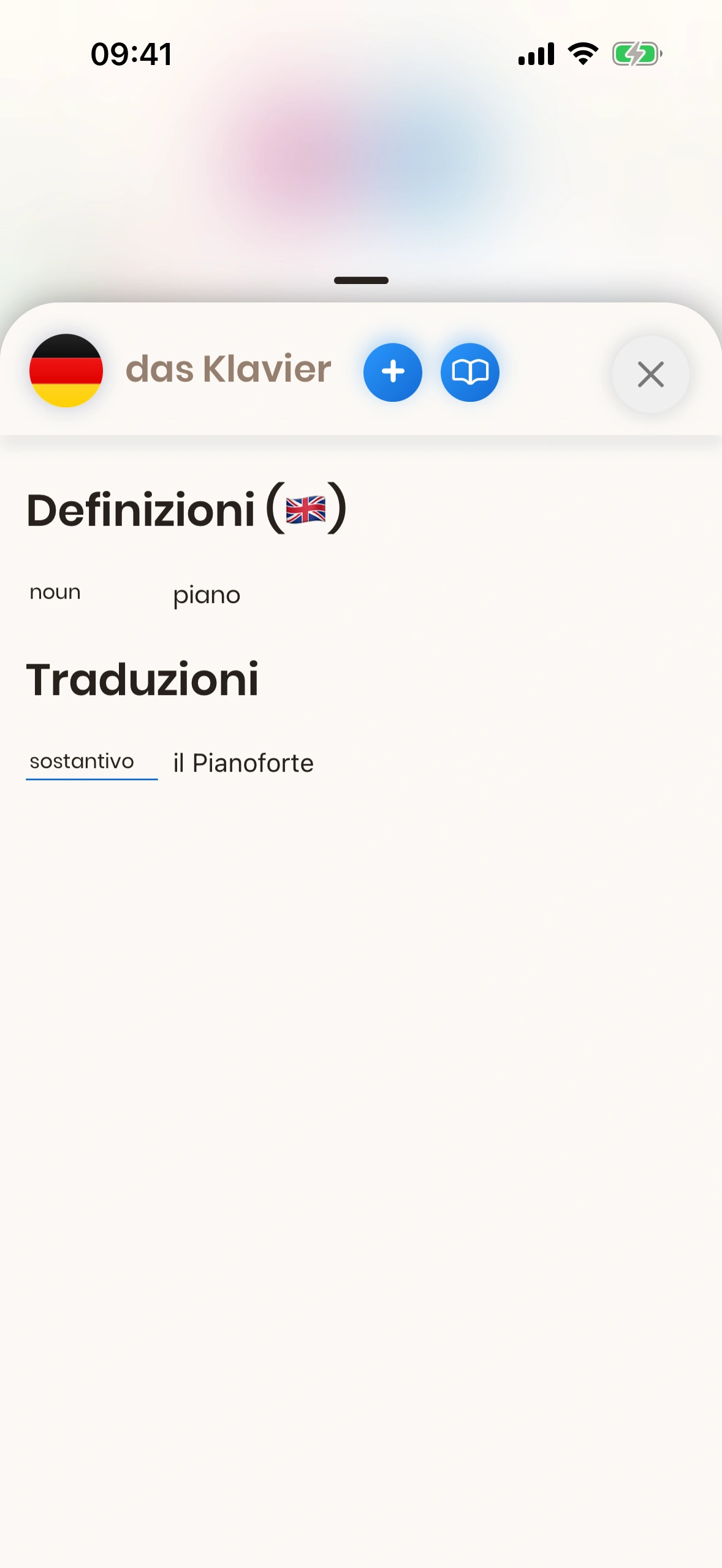 Il pulsante Aggiungi per le parole è disponibile in vari punti di Just German. Offre le seguenti opzioni quando lo tocchi: