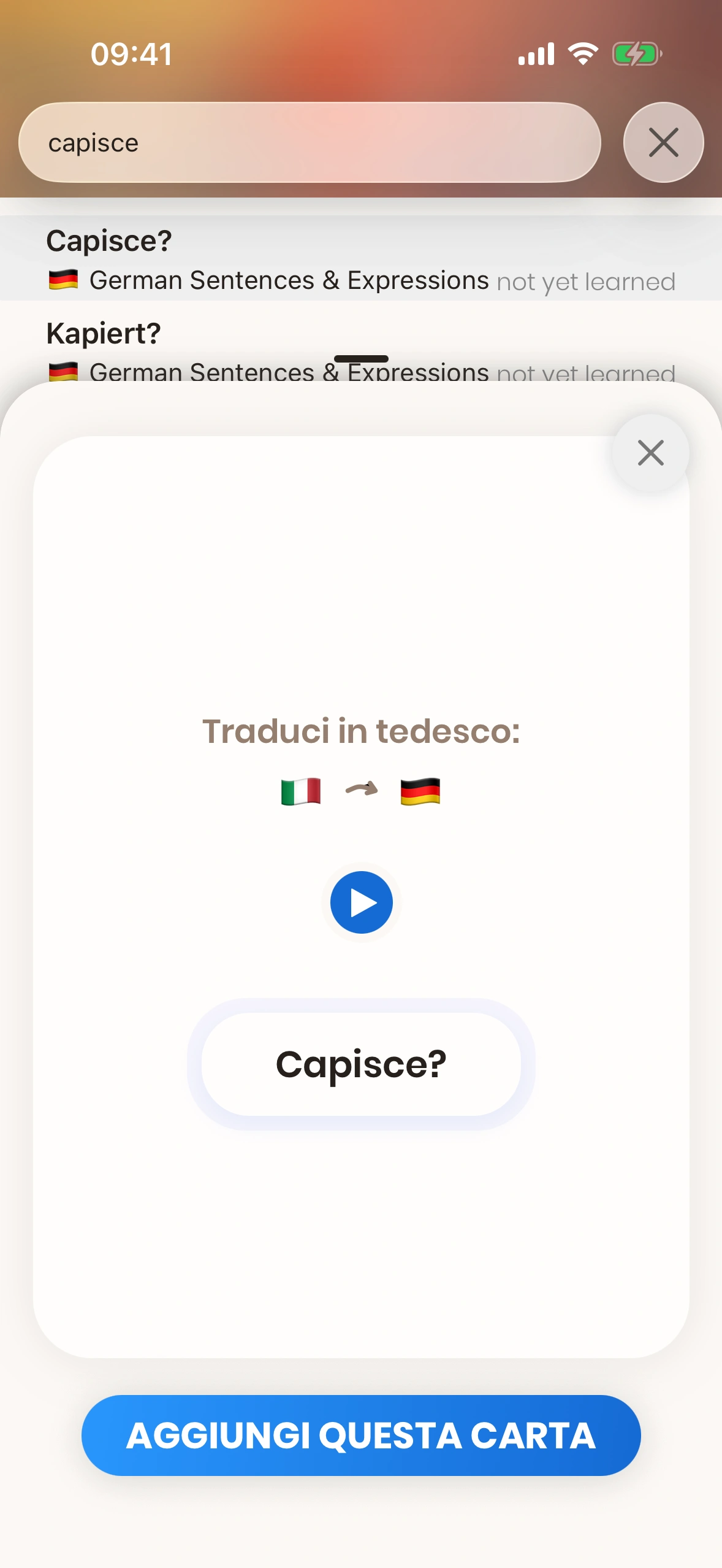 Se non sai come tradurre una parola specifica, puoi cercarla nel dizionario e poi aggiungere questa carta toccando il pulsante AGGIUNGI QUESTA CARTA.