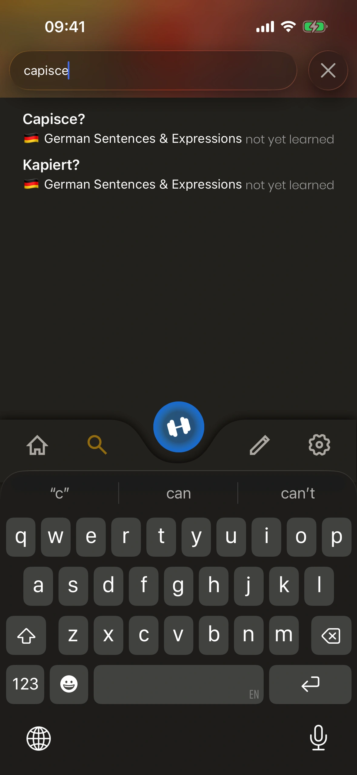 Just German offre un dizionario completo, dove ogni voce del dizionario è una carta che puoi aggiungere alla tua coda di apprendimento!